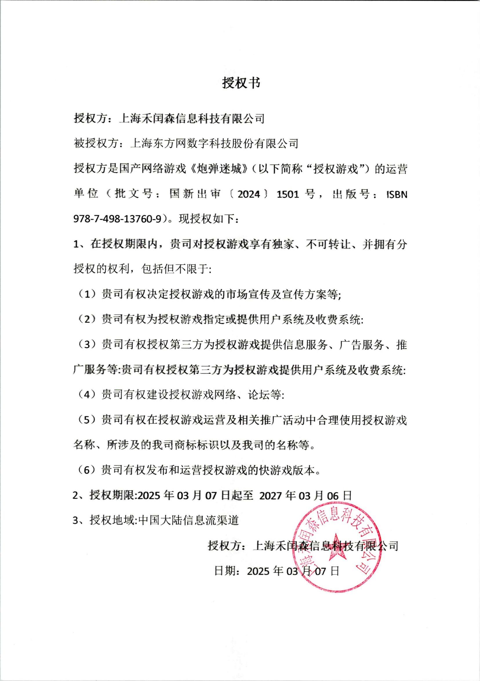 《炮弹迷城》[简称:炮弹迷城]以下简称“授权游戏”软件著作权登记号:2023SR1796006)是上海禾闰森信息科技有限公司自主研发或经合法授权获得的移动网络游戏产品,对授权游戏拥有合法权利,足以授权上海东方网数字科技股份有限公司运营发行授权游戏。现上海禾闰森信息科技有限公司以独占许可的方式授予上海东方网数字科技股份有限公司授权游戏的运营权,上海东方网数字科技股份有限公司可自行运营授权游戏也可授权第三方运营授权游戏。 查看授权书